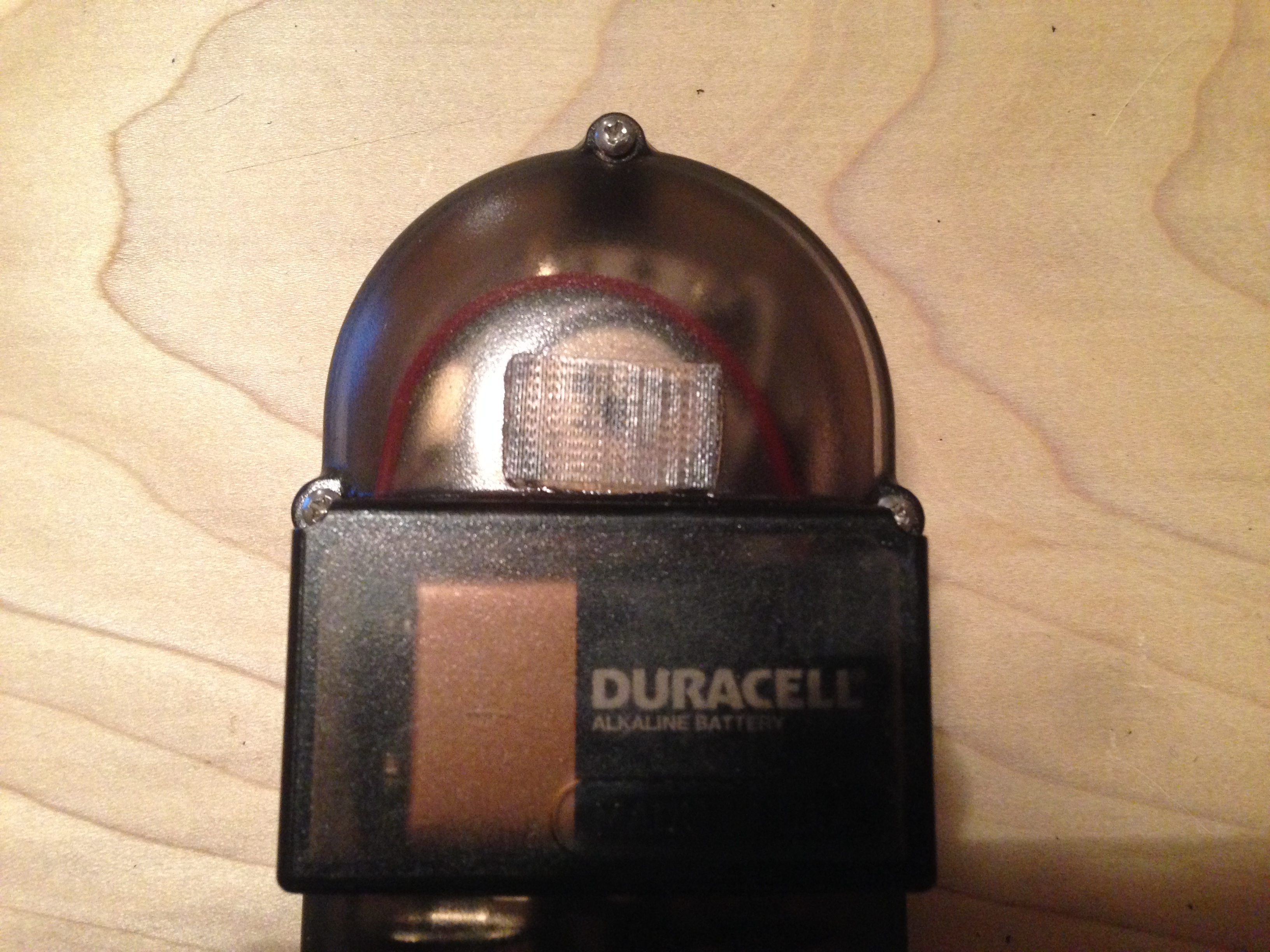 c. Pull the backing off of the 1/2” strip and adhere it to the back of the mini amp, just behind the speaker and against the battery casing.