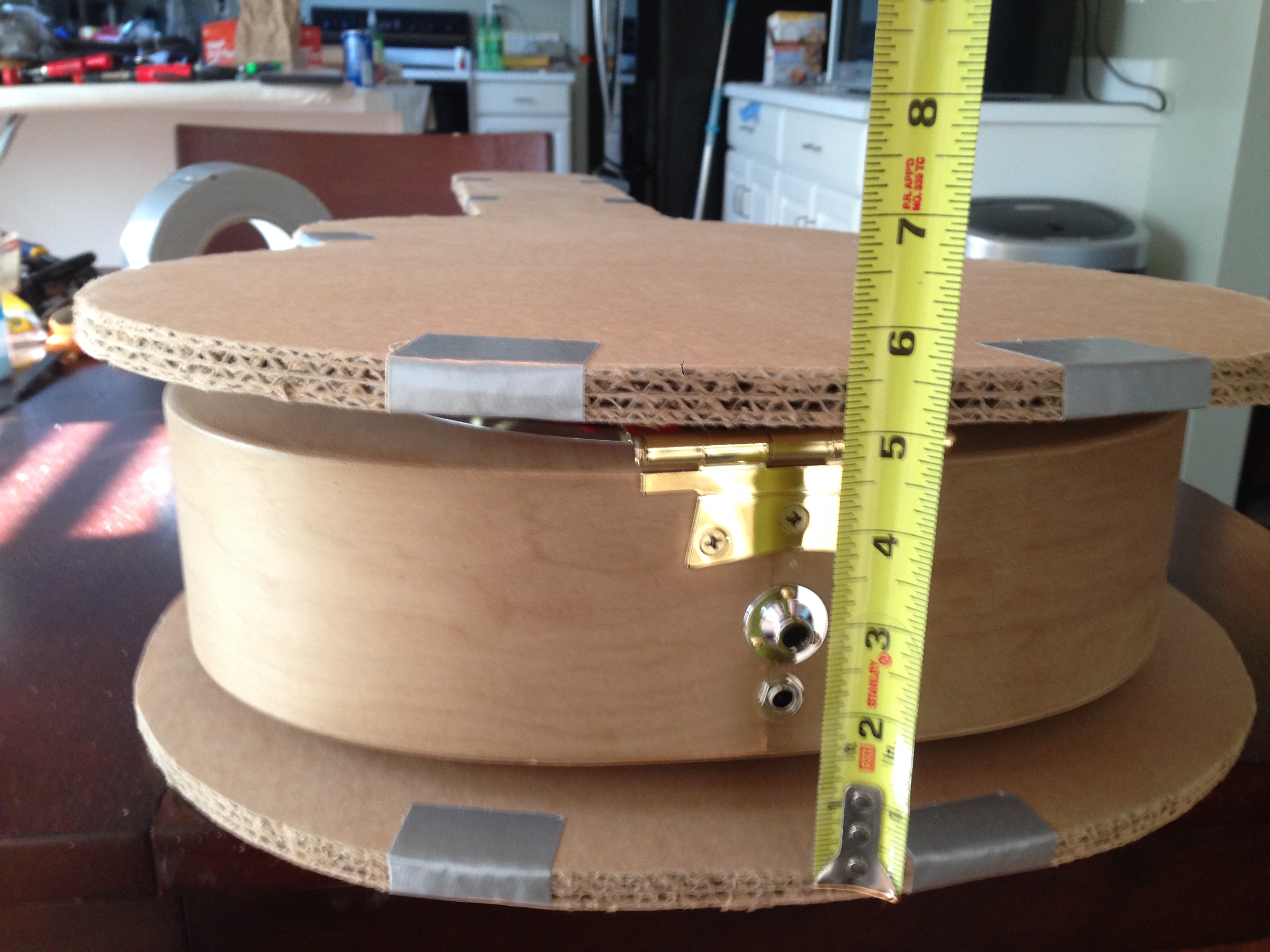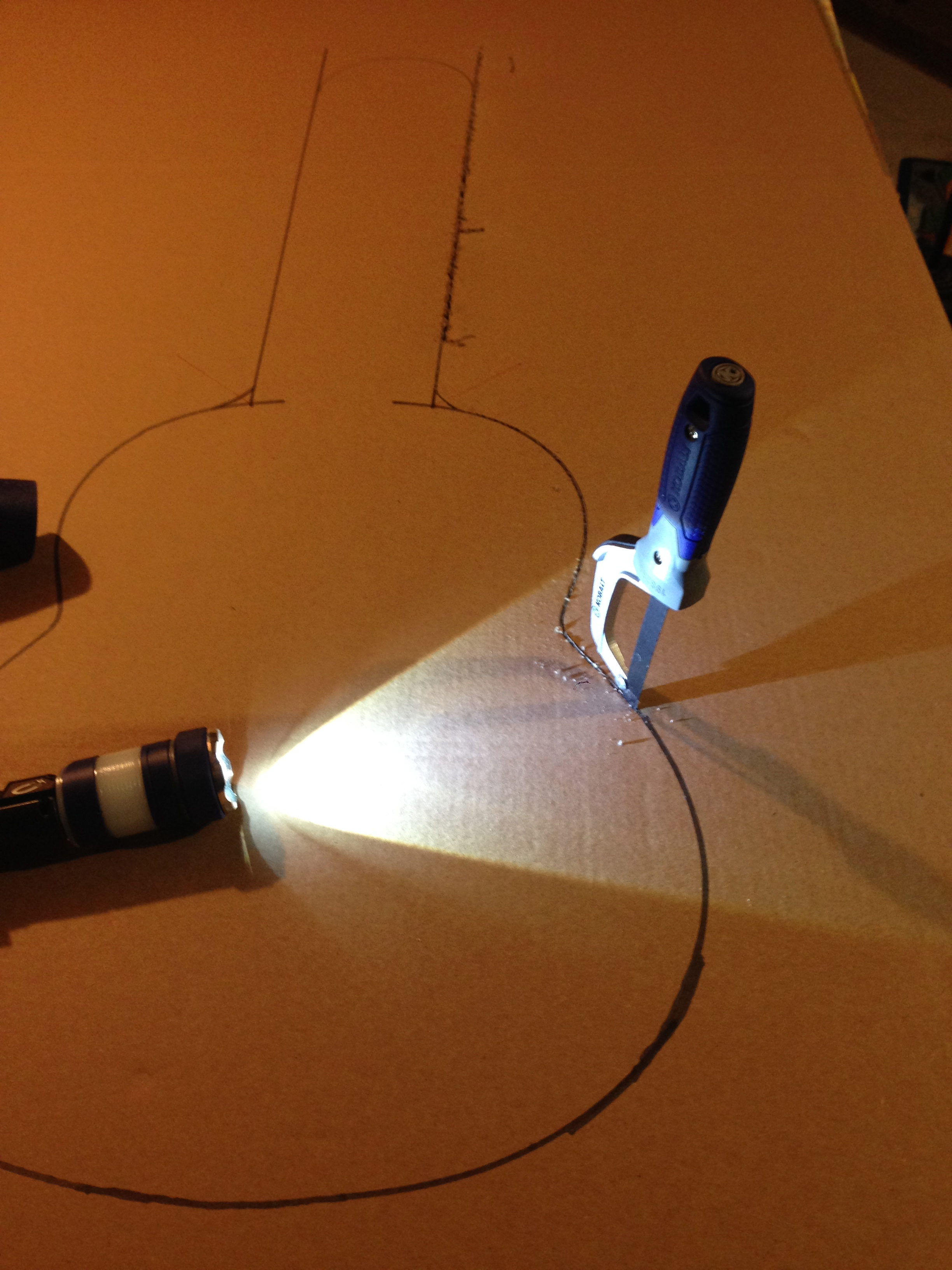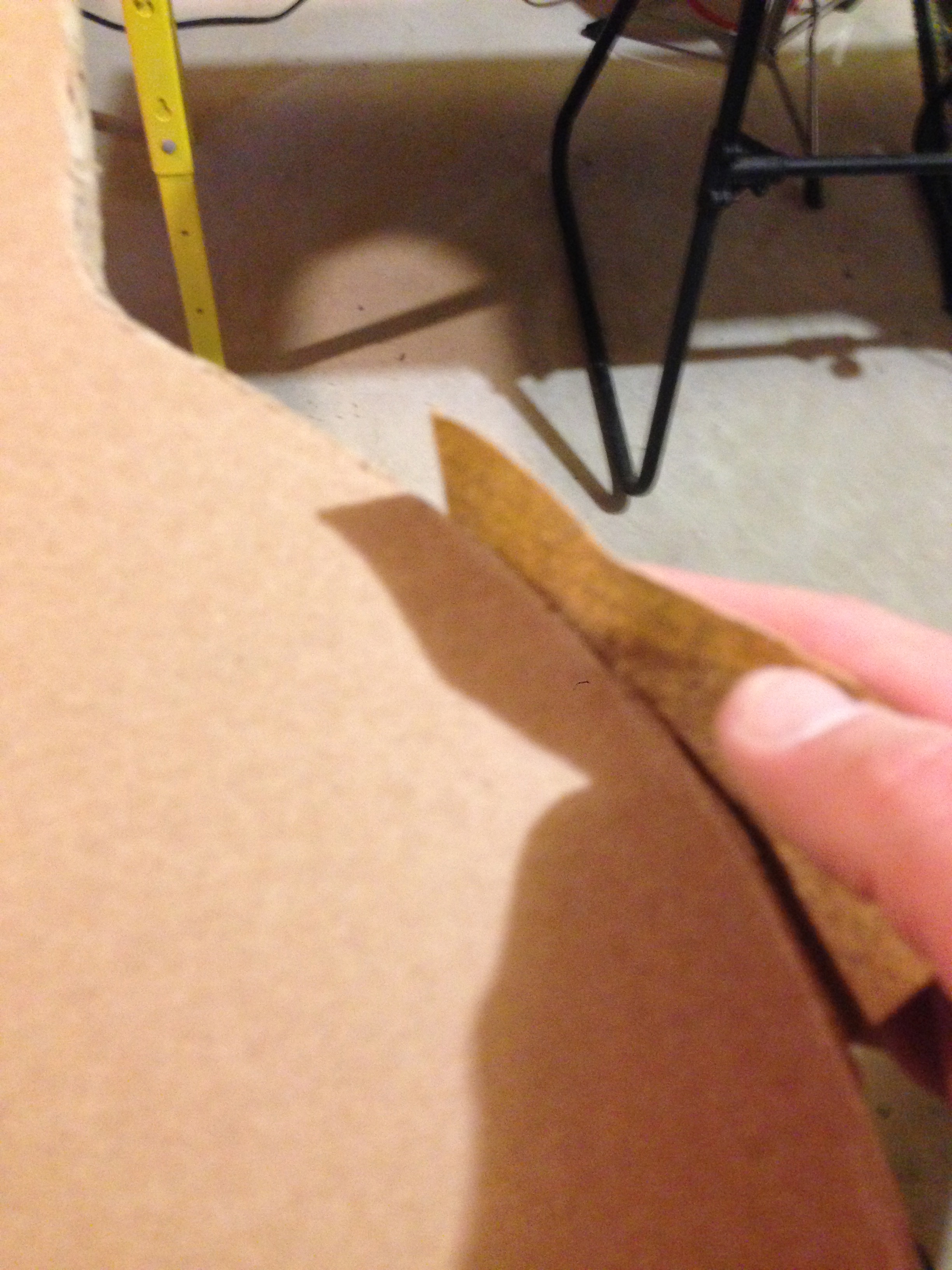 At this point, the box was folded in half creating an 8-ply thickness. I cut along the guide line with a mini hacksaw, which produced a pretty clean cut. Then, I filed the perimeter of the cutout, following up with some 150 grit sandpaper. I checked the cutout against the guitar and it appeared to fit well.