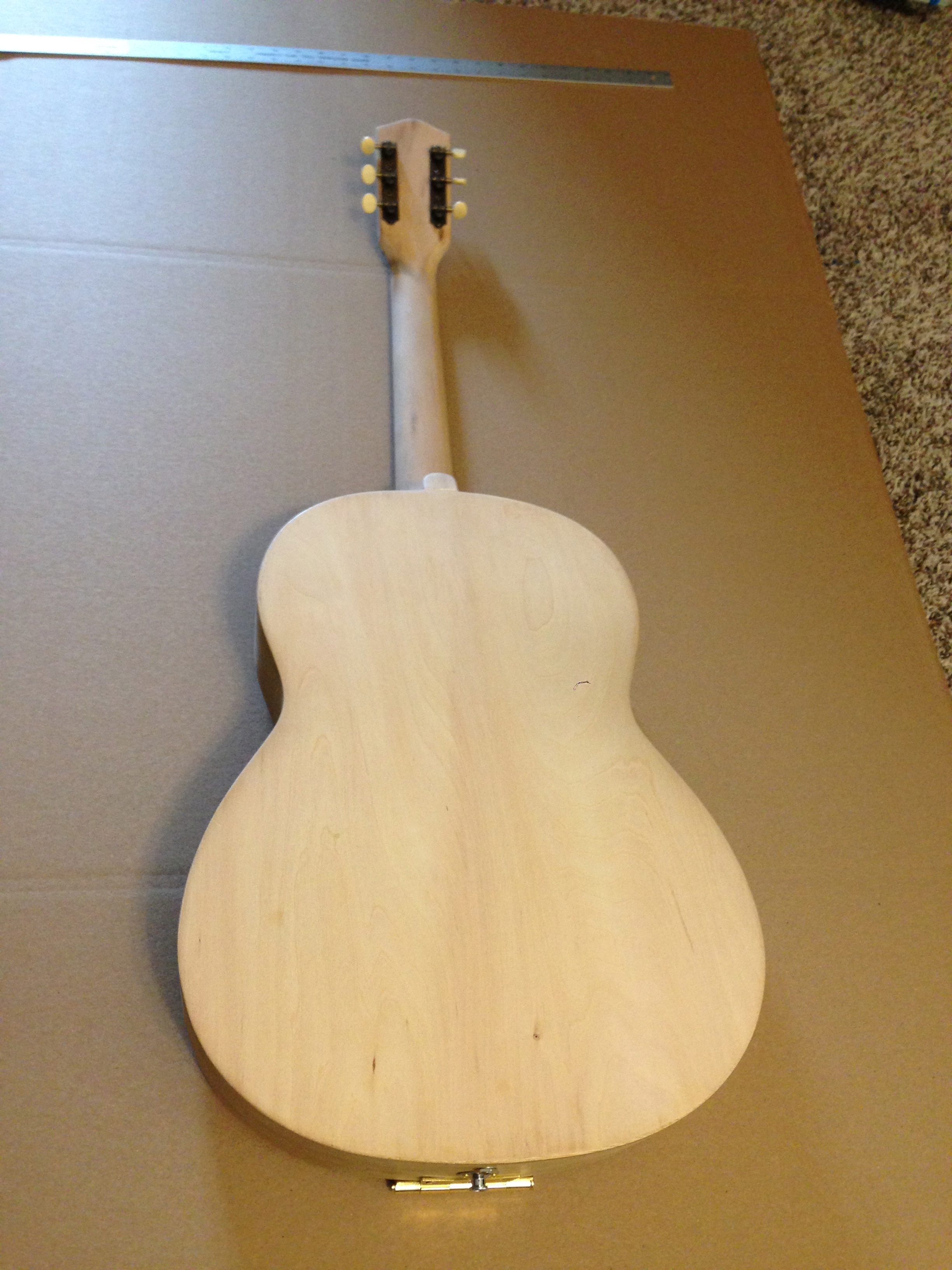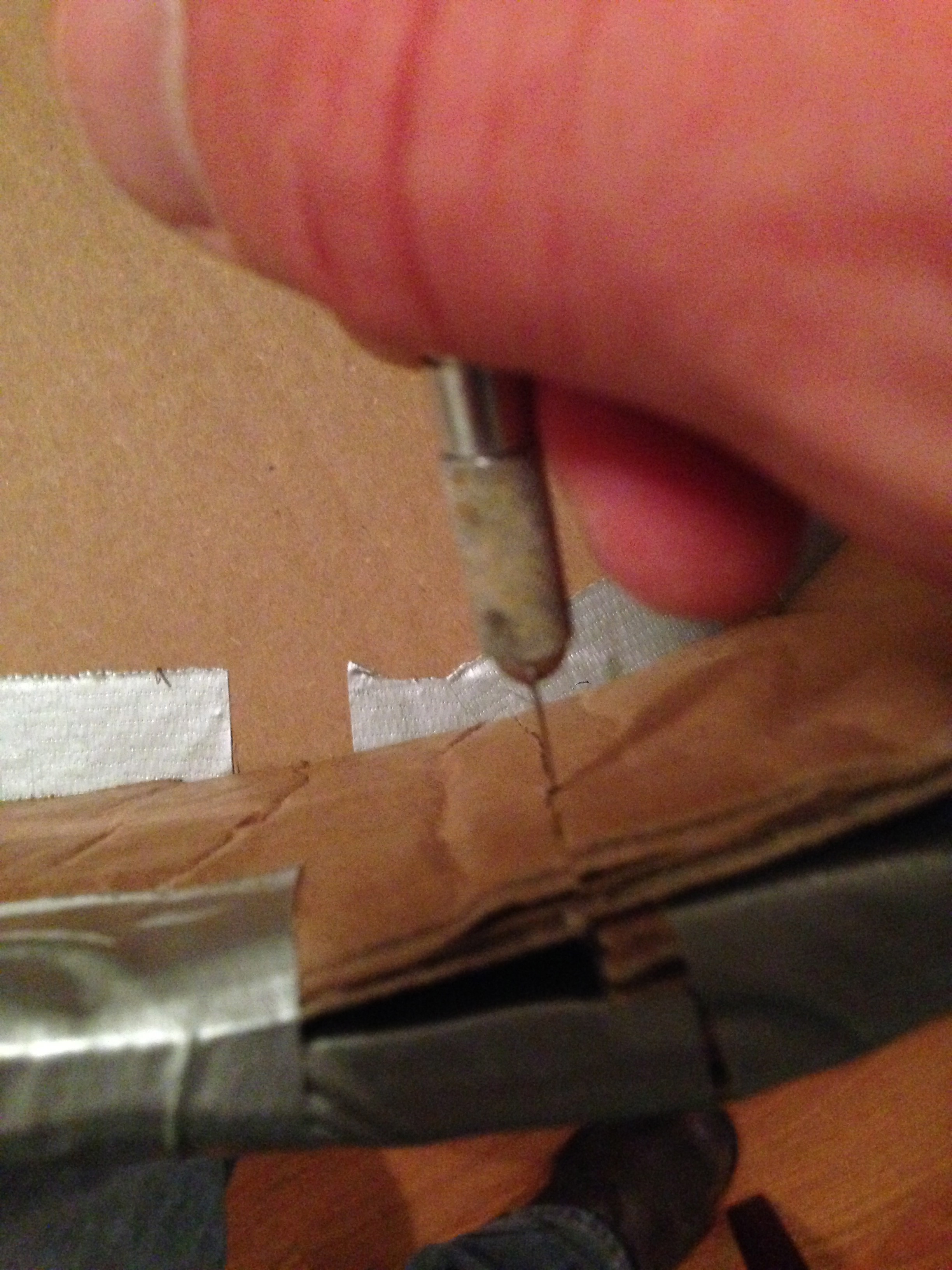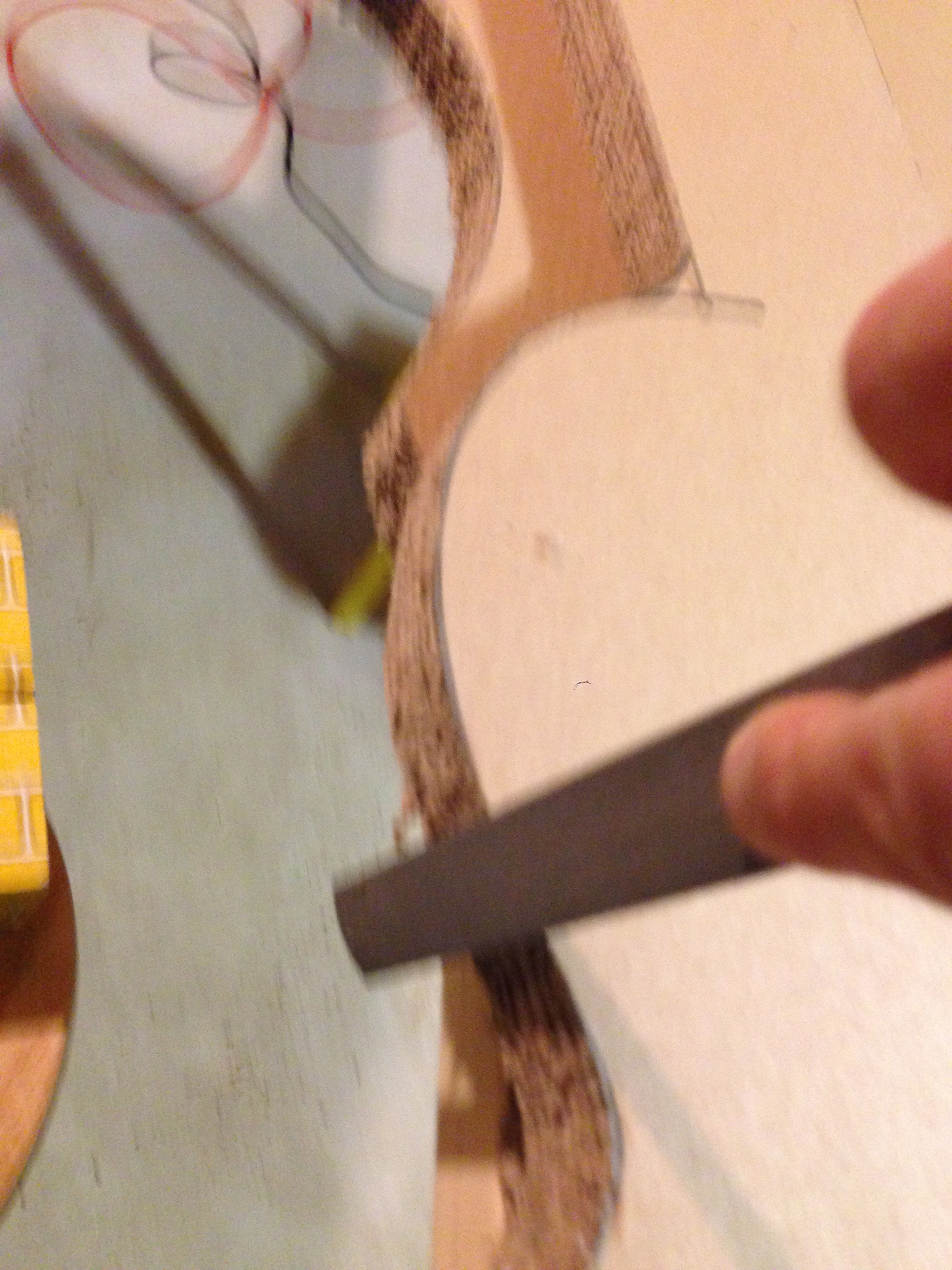 At this point, the box was folded in half creating an 8-ply thickness. I cut along the guide line with a mini hacksaw, which produced a pretty clean cut. Then, I filed the perimeter of the cutout, following up with some 150 grit sandpaper. I checked the cutout against the guitar and it appeared to fit well.