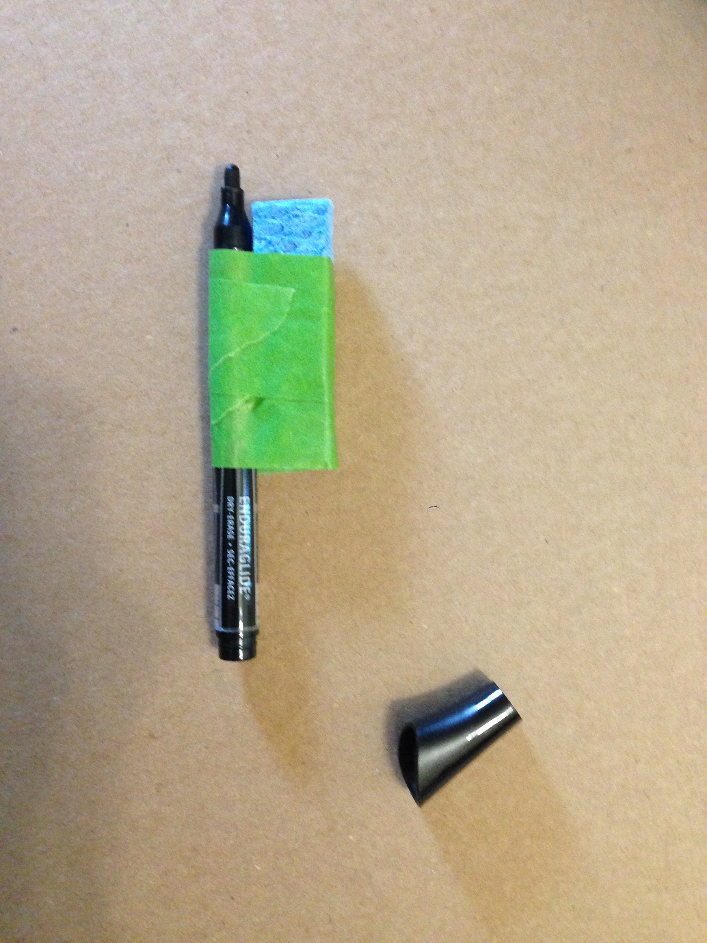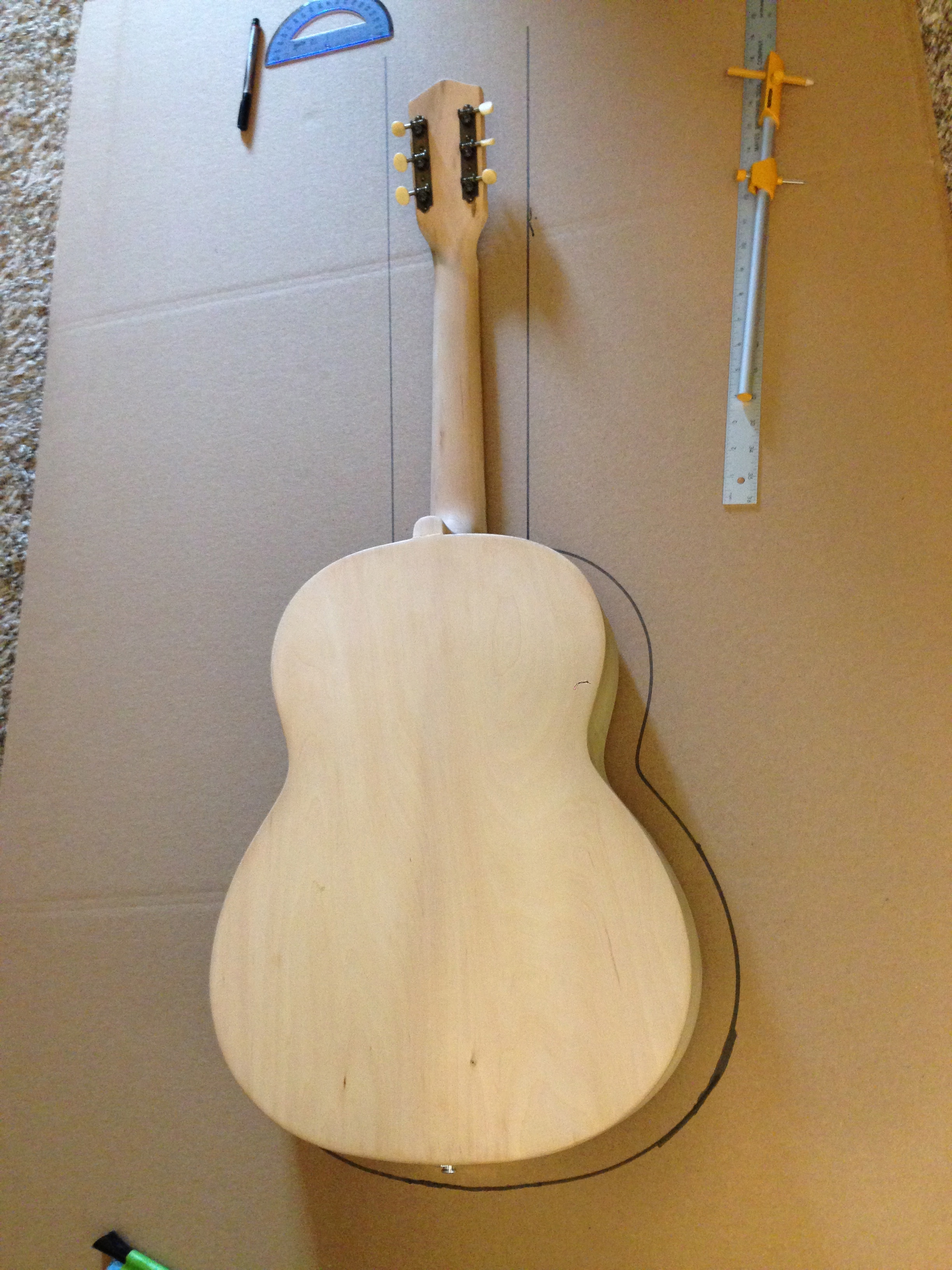 I began by tracing the guitar for a custom fit. I cut a thin sponge down to a 3/4” strip, and taped it to a marker to create about a 1” outline around the body of the guitar. Then I measured about an 1” on either side of the tuning machines and finished the neck portion of the case with a ruler and a compass to round off the top.