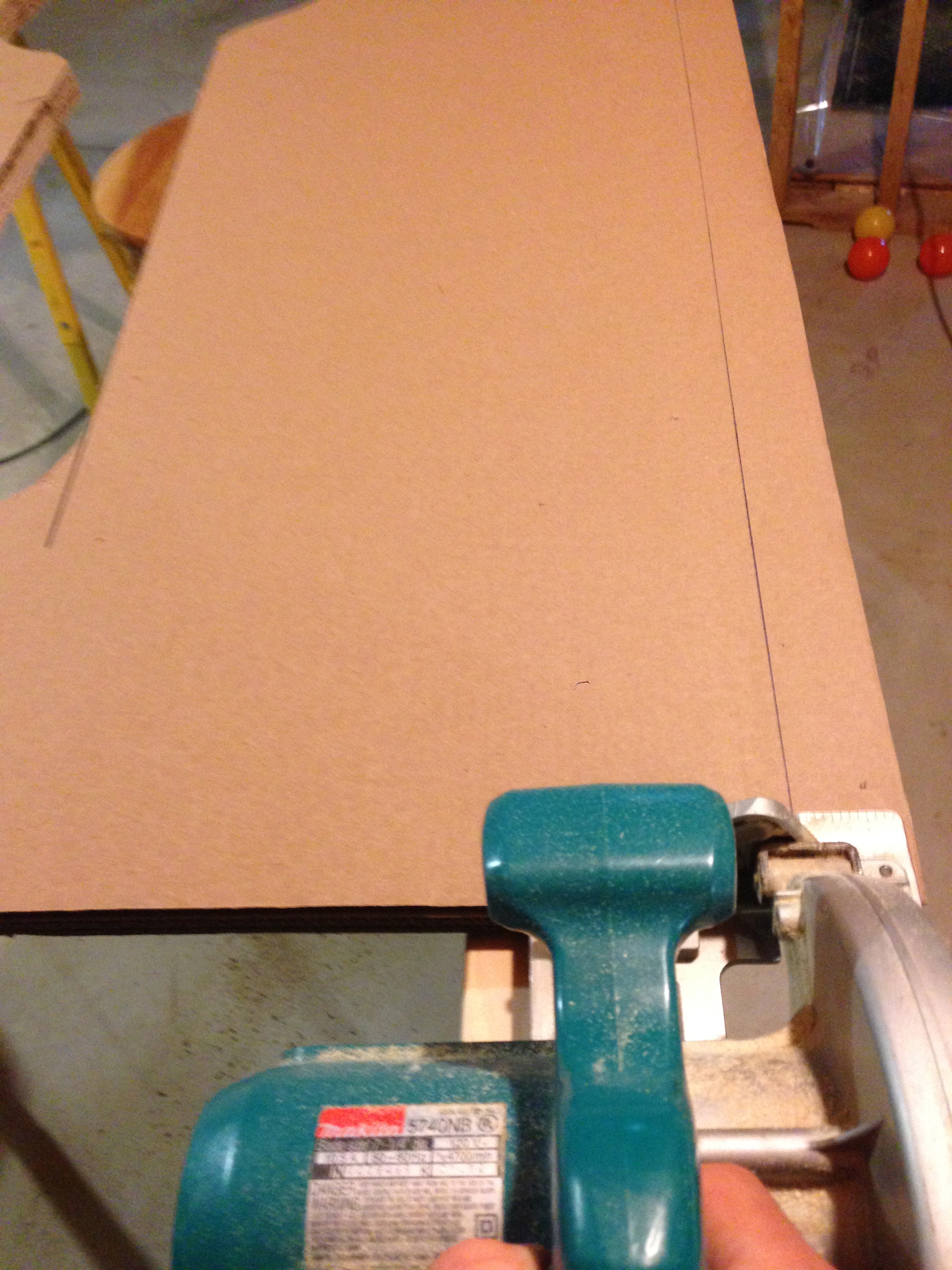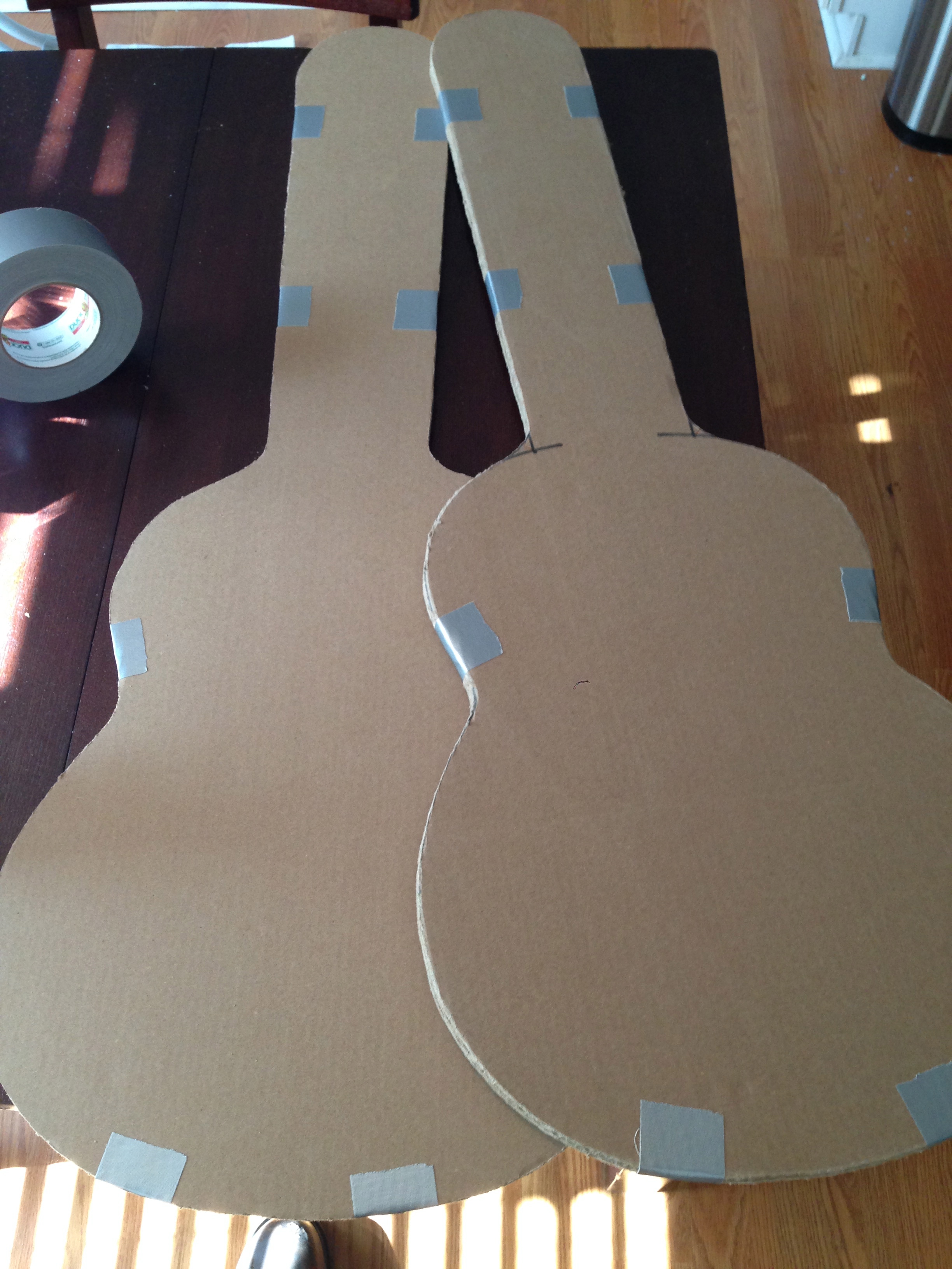 I split the cutout in half and duct taped two sets of four plies together to create a top and bottom for the case. I placed the guitar in between the cutouts and measured the thickness needed for a secure, yet comfortable fit. Five inches appeared to be reasonable, so I drew a 5” strip on the remaining cardboard from the cutout and cut it with a circular saw. I cut two additional bundles of strips.