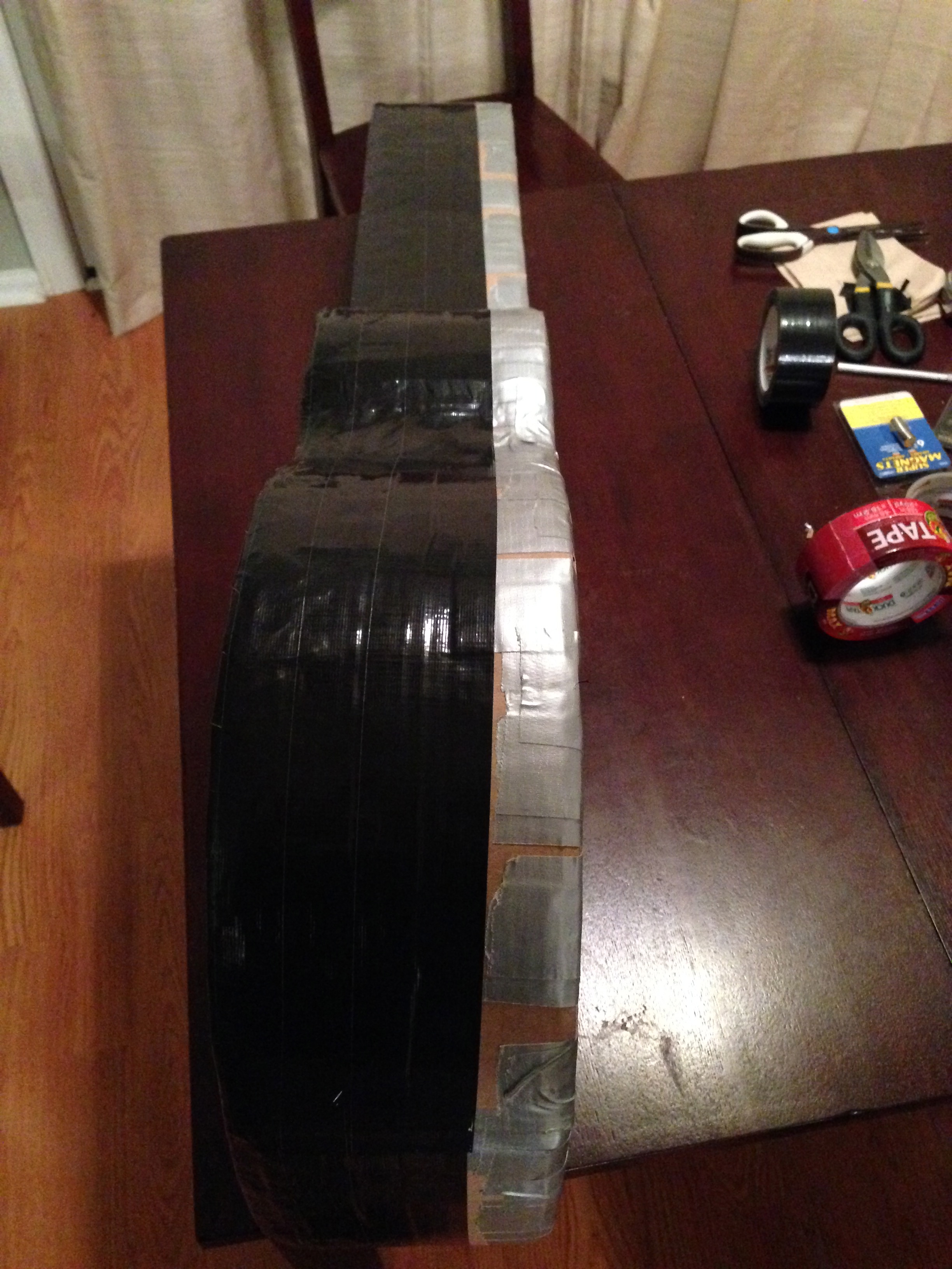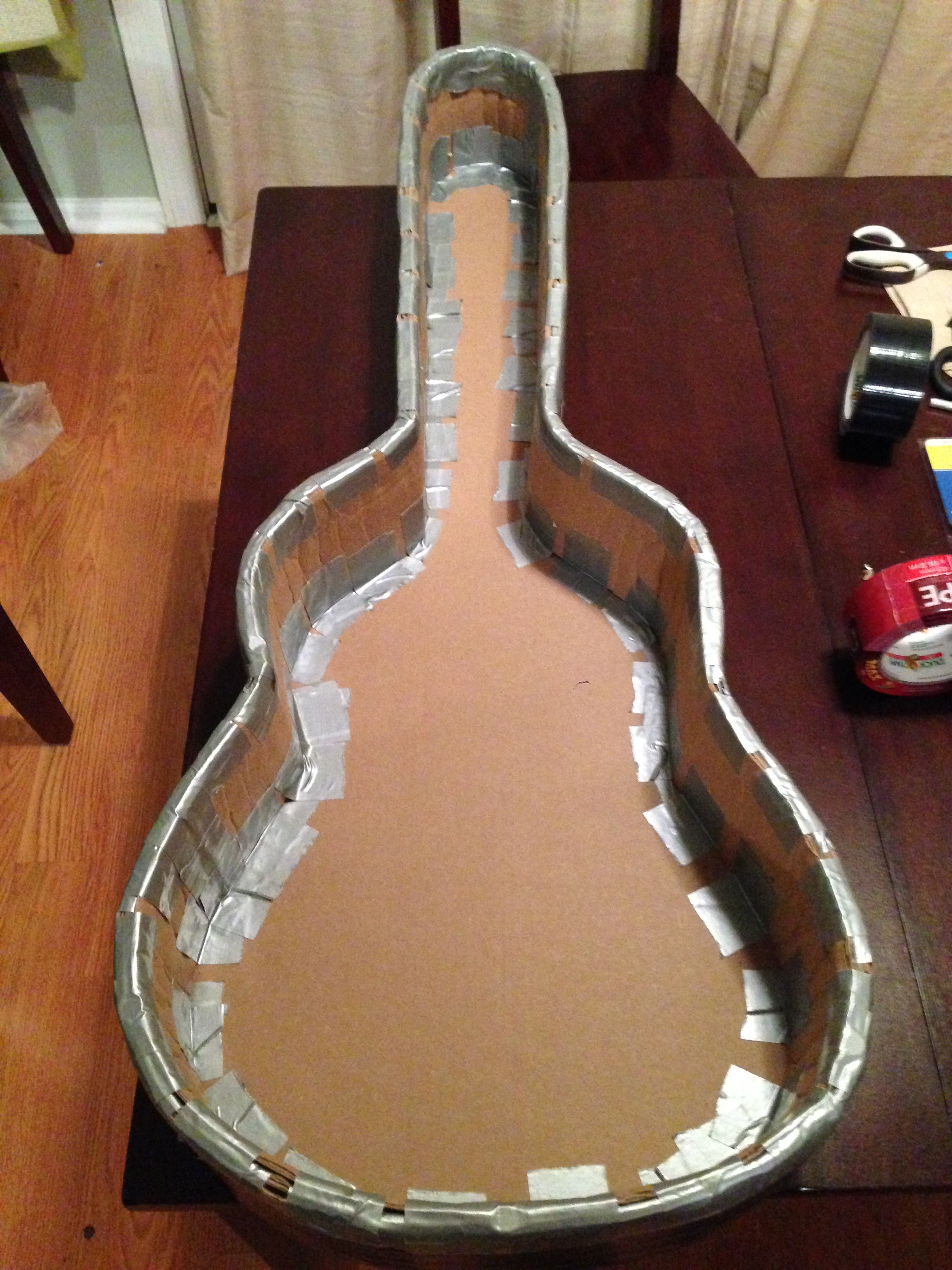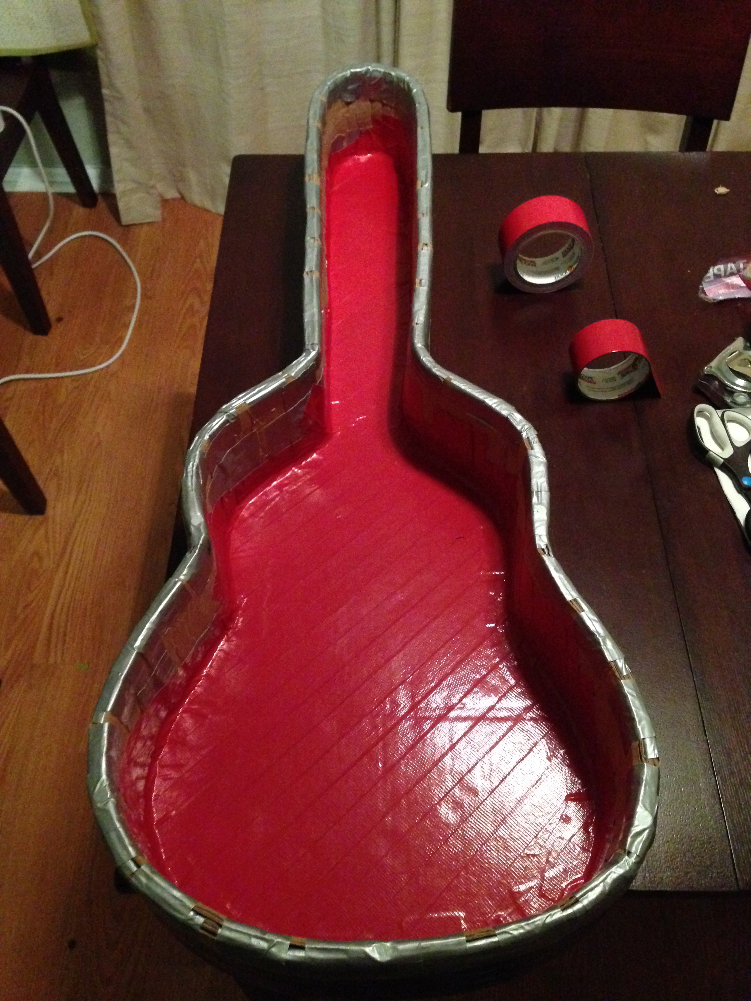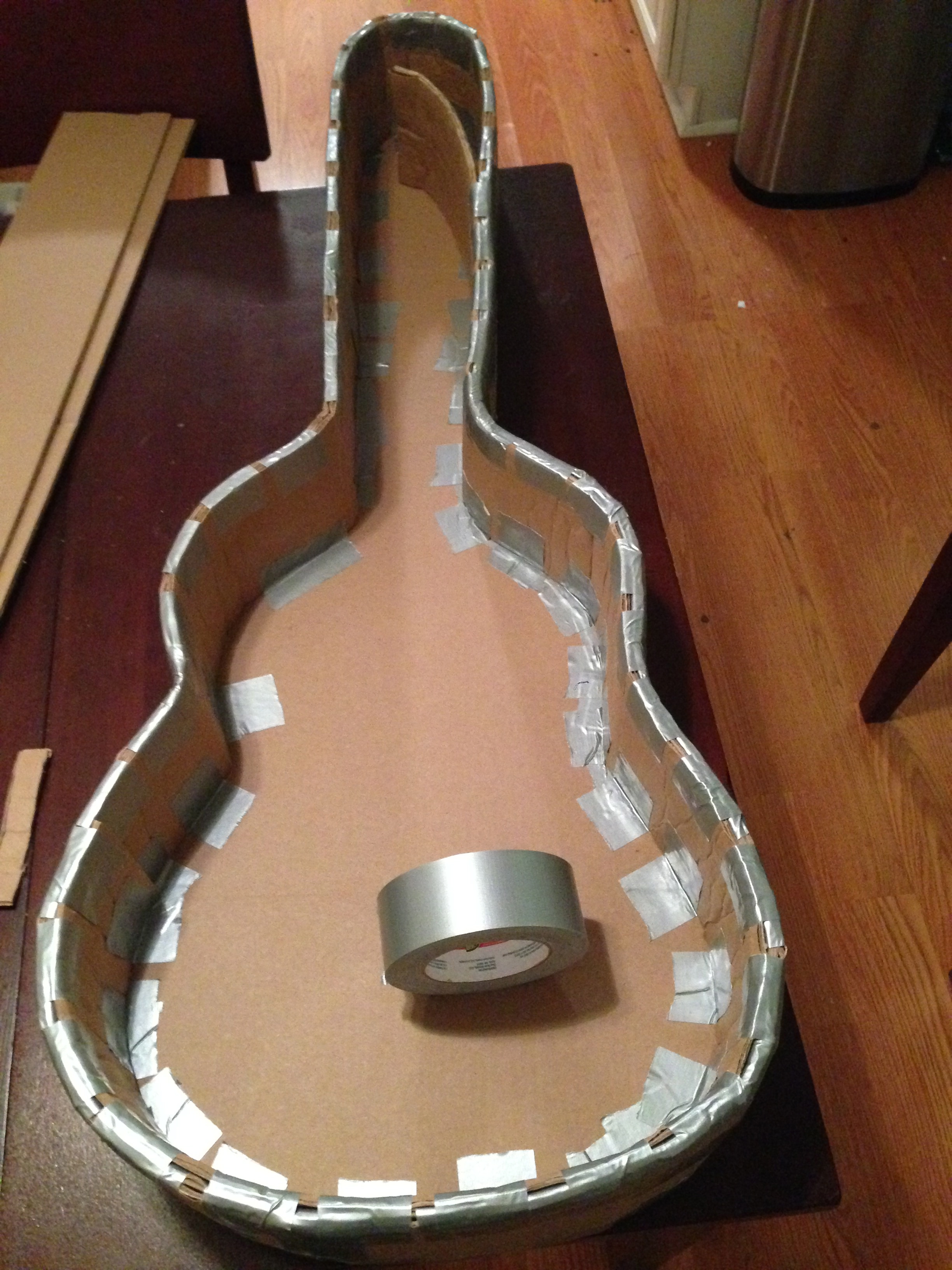 Using duct tape, I formed the outside shape for the side of the case. I added a second and then a third layer to the inside of the case—at this point it felt pretty solid. I spliced the ends together and then checked the fit of the guitar, along with confirming that the sides were deep enough by checking the lid. I reinforced the bottom and sides with gray duct tape and then began applying black duct tape to the bottom. I decided to create diagonal stripes with the tape and covered the bottom, pulling it tight as I secured the ends up the sides of the case.