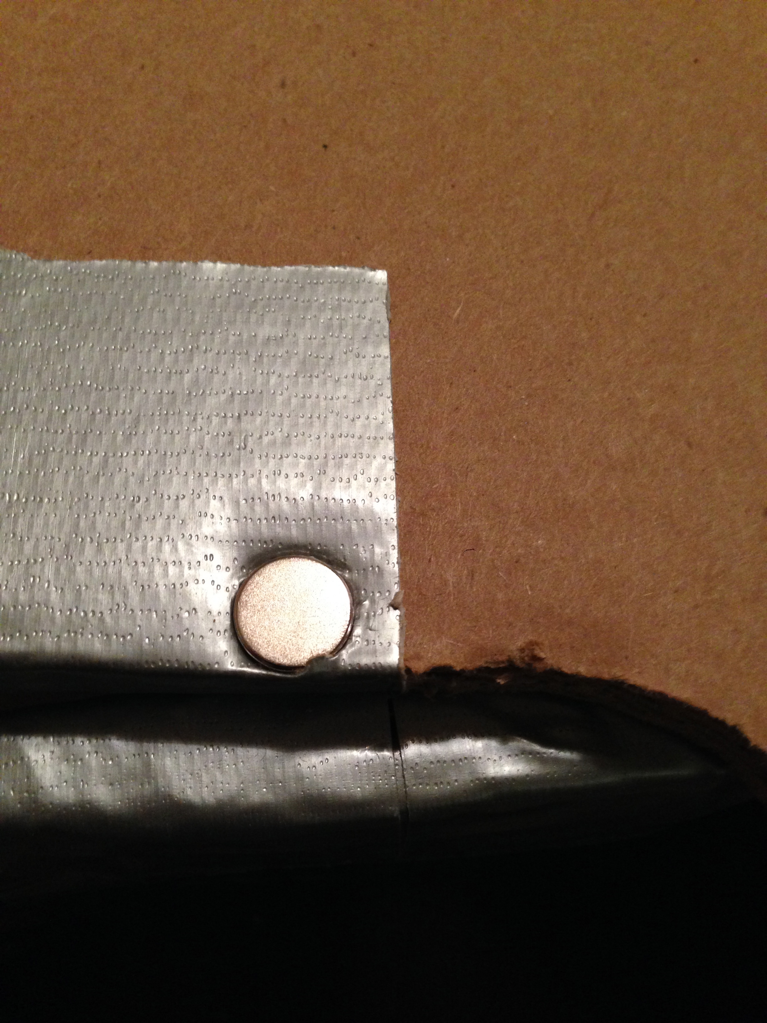 I prepared the lid and sides of the case for the magnets that would hold the lid on the case. I cut small holes in ten places around the rim on the sides of the case and then cut ten holes in similar locations on the bottom of the lid. I installed the magnets such that the sides would attract the lid, and then secured the magnets with duct tape and tested the lid.