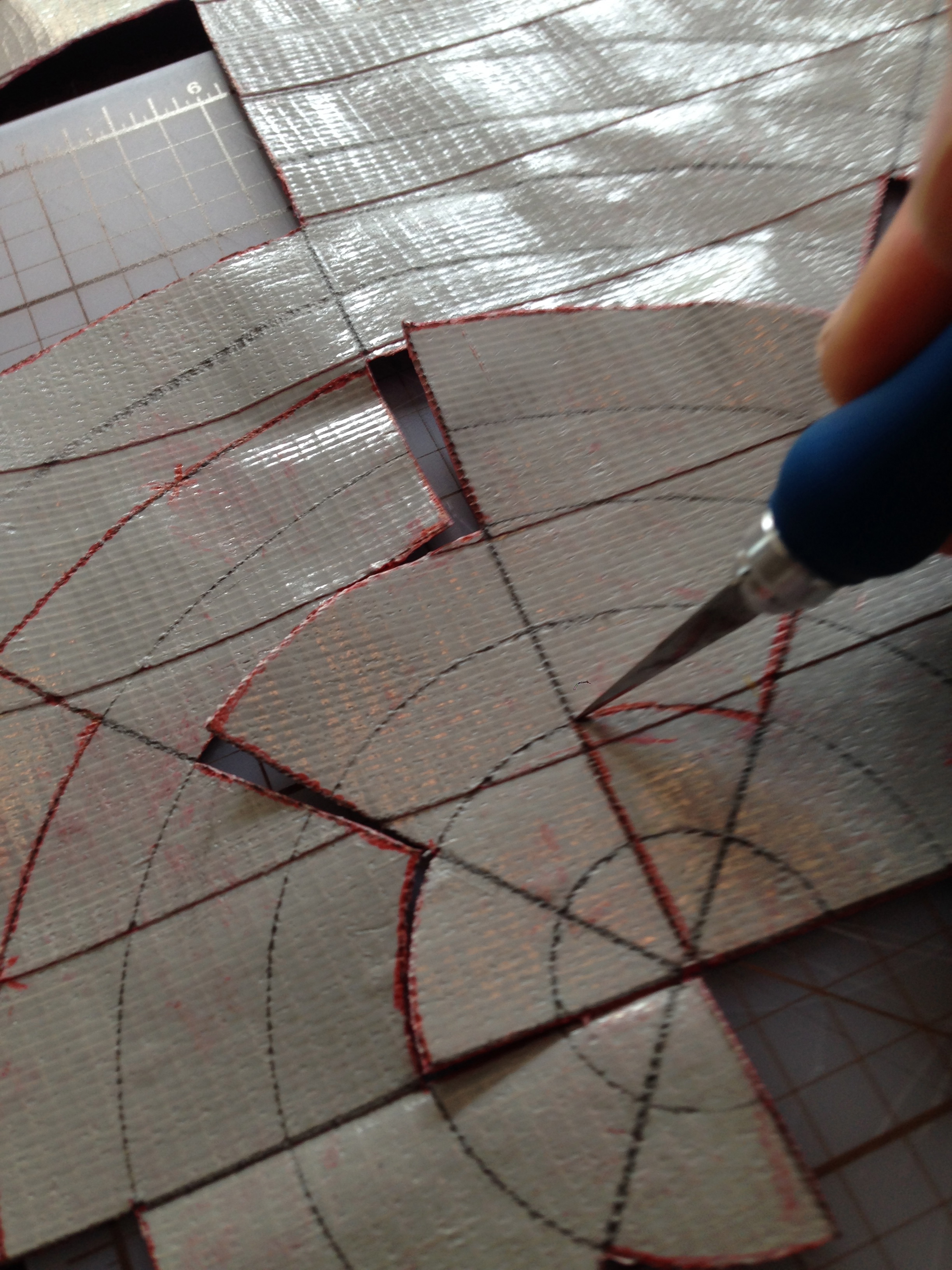 The spiral design is something I created a long time ago for a band that never came to fruition. I placed tight layers of red duct tape in steps (much like the back of the case) until I reached a desired length and width. Then, I sketched out the circular graph on the back of the tape with a ruler and compass. I drew the spiral backwards and then cut it out with an X-acto knife. It attached to the lid easily and turned out surprisingly well.