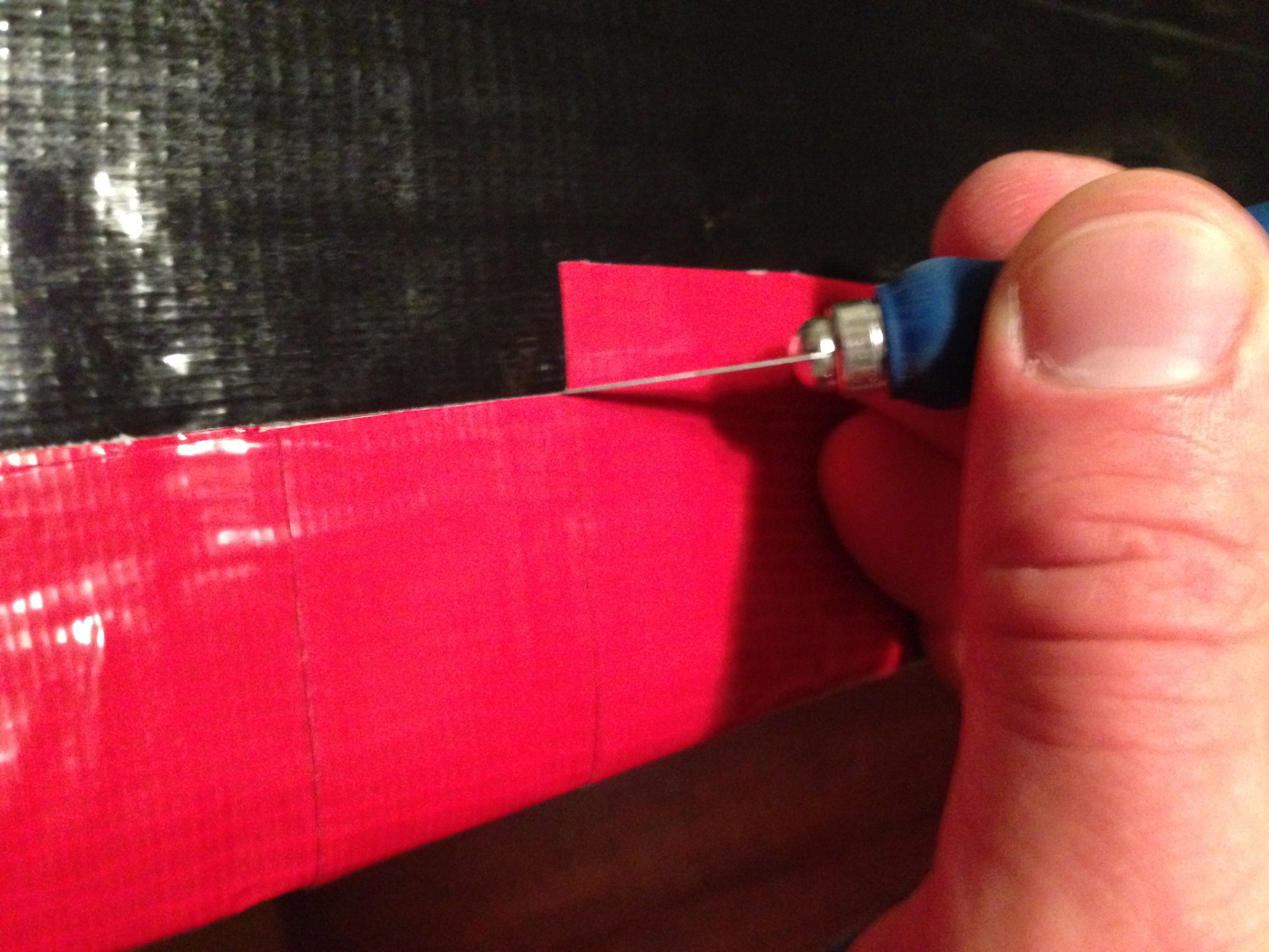 To create the red stripe around the outside of the rim, I continued running the black duct tape in overlapping strips up the side of the case until there was a thin strip of red around the rim. I applied red duct tape on the bottom side of the lid—I cut the strips of tape long and cut it to shape so that there was a thin strip of black around the underside of the lid. Lastly, I used scrap cardboard and red duct tape to create a neck rest and storage compartment.