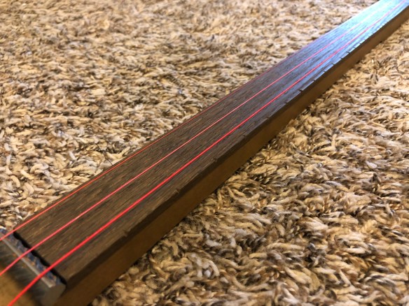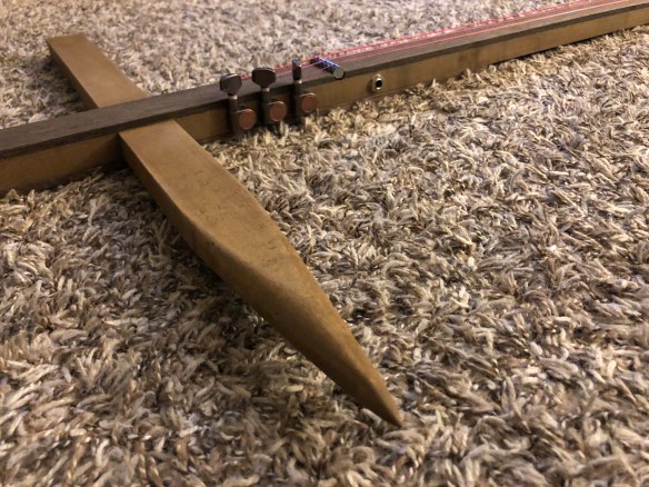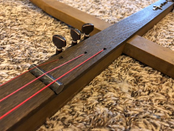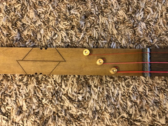 The brass knurled nut string clamps were located on the “headstock” portion of the build to hold the strings tightly. Two lengths of 3/8″ rebar are cut to 1-1/2″, ground flat on the bottom and polished on top. The polished tops were later notched with a five to keep the strings in place.