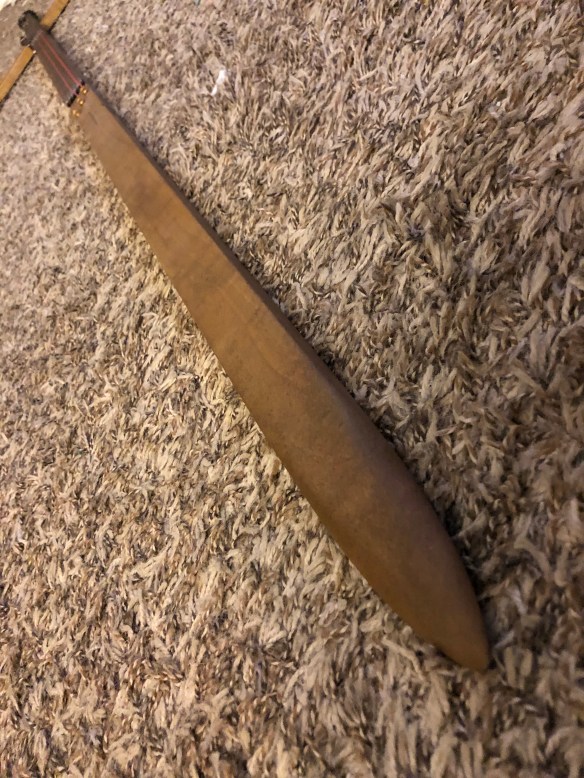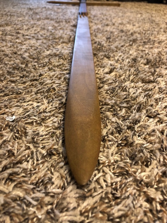 There was not a headstock per say, so I carved the double blades in the position where they would have been found had this turned out as normal length guitar.