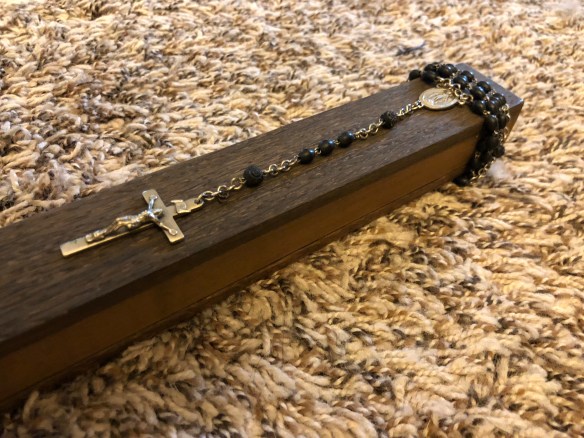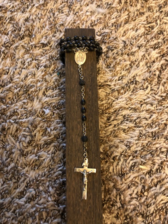 The rosary was wrapped around the top and then hot glued to the hole in the wood.
