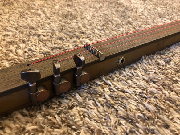 I installed one Nd144 electromagnetic pickup in the neck position. It is concealed beneath the extended fretboard and is wired directly through the output jack. The jack is located just below the tuning machines on the side.