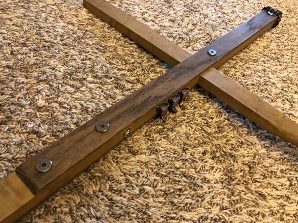 Before assembly, the bottom of the cross was ground down to a spear and the cross beam was ground to a sharp stake. Both the maple neck/body and the oak components were finished with two shades of vinegar and steel wool stain—white vinegar and red wine vinegar, which let the wood with a heavy red tone.
