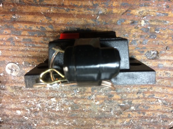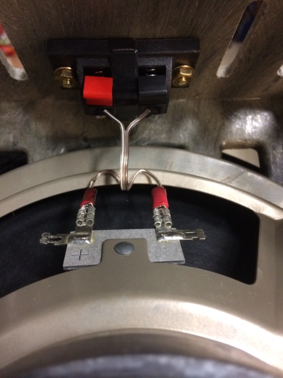 I attached the adapter jack to the top of the crate using the remaining nuts and bolts and then wired the speaker to the adapter jack. Later, I added a 1/2″ plastic clamp to hold the 1/4″ plug in place.