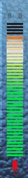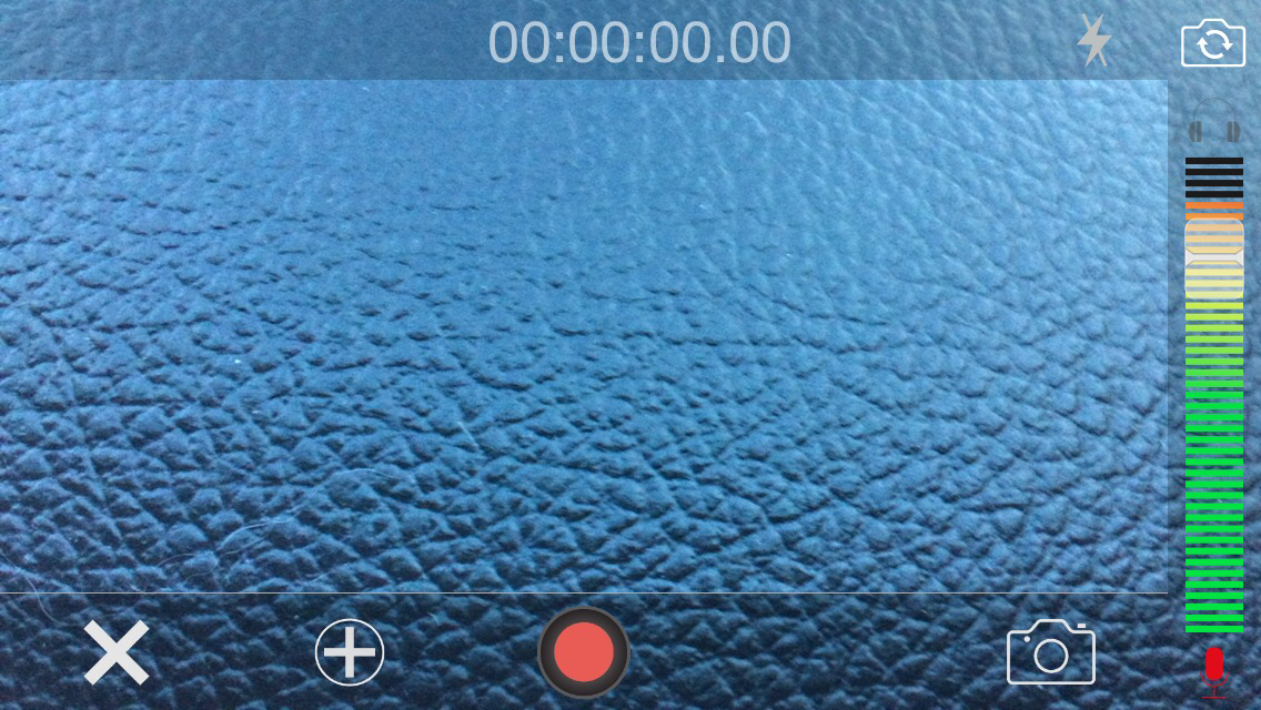 You must also set the audio signal. The red microphone in the lower, righthand corner indicates that the app is monitoring and is ready to record. The light bar above the red microphone shows the sound level—it begins on the bottom at green (lowest level) and moves up through increments of yellow, orange, and then red. The small rectangle with the white, horizontal line is a fader; it allows you to raise or lower the input signal.