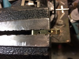 I began by straightening the top part of the picture hanger. Then, I cut the hanger just above the first hole. Next, I clamped it in the vise and drilled a small hole for soldering the hot wire.