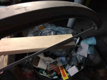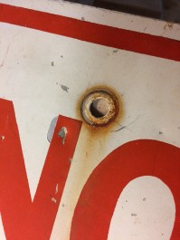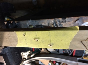 I checked the placement of the sign and then marked the bolt hole locations. The holes were drilled and filed and then a 1/4×2 strip of oak, that I had cut for a back accent cover, was lined up and clamped to the back. Matching holes were drilled in the oak strip.