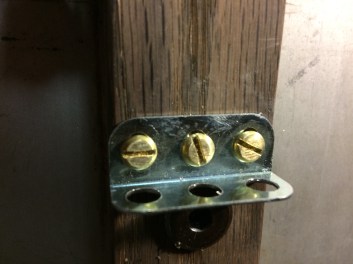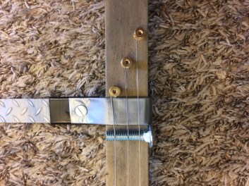 I had wanted to used bolts consistent with those used to fasten signs to posts, but the heads were too high for proper string clearance, so I used low profile furniture bolts. I found the correct length and then cut them down to size with a hacksaw.