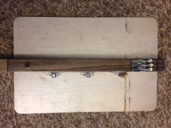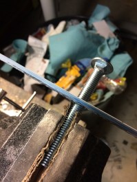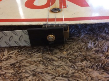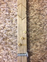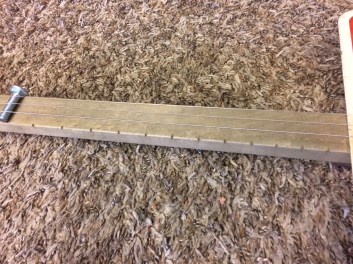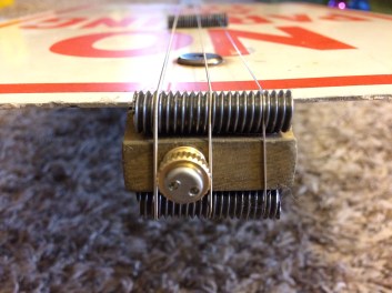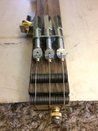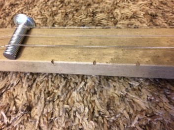 A carriage bolt was cut for the nut and a few pieces of thread rod for the string guides and bridge. The bridge was filed flat on the bottom and left-handed rod was used to maintain an angle congruent with proper intonation.