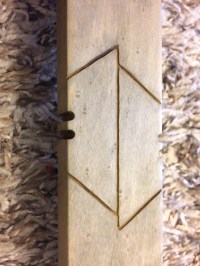 Two quarter grooves were filed into the bottom corners of the guitar on the front and back to guide the guitar strings from the back to the front since the tuners would be located on the back.
