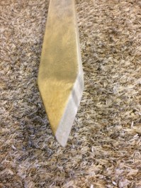 The headstock is arranged similarly to the other Staggered Blade guitars with the carved razor brand, knurled nut string fasteners, and the carriage bolt nut. Of course, this razor brand is not cut out on top to allow for the additional length of the post and stake.