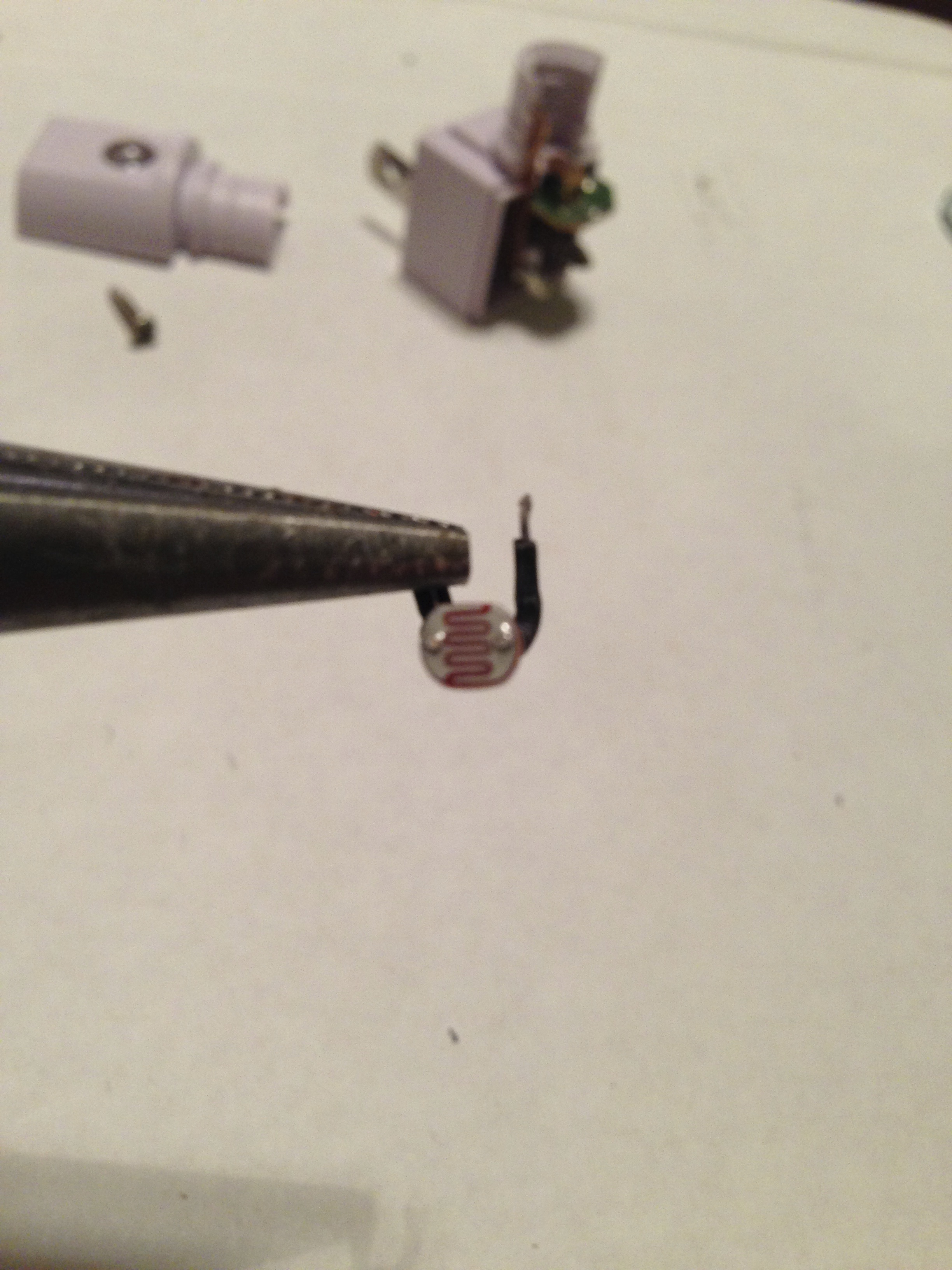 e. Locate the photocell—it should be round with a squiggly line and two wires coming out of it. Both photocell wires will be soldered to the board. You must heat the solder with a soldering iron and gently remove each of the wires from the board one at a time. Place the casing in a vice; if you do not have access to a vise, ask someone to help you. Grip one of the wires (not the photocell) with a pair of needle nose pliers and pull the wire away from the board as you melt the solder. Repeat for the second wire.