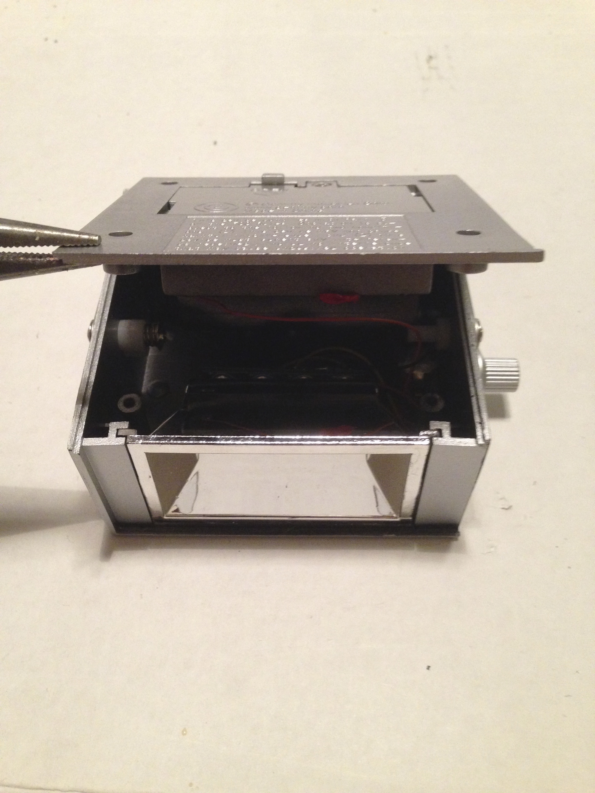 f. Turn off the lights and test the unit as before, to make sure that the photocell was not knocked out of place while replacing. If the unit is not working properly, remove the cover and test the wires to make sure that they are secure and the check the photocell placement; if it is, congratulations. You may notice that the unit has a less pronounced tremolo effect when the lights are on. This is caused by outside light entering the unit through holes in the reflector. If this happens, simply place the lens against something or the unit inside of something or place some removable painter’s tape over the lens to reduce the amount of light bleeding in.