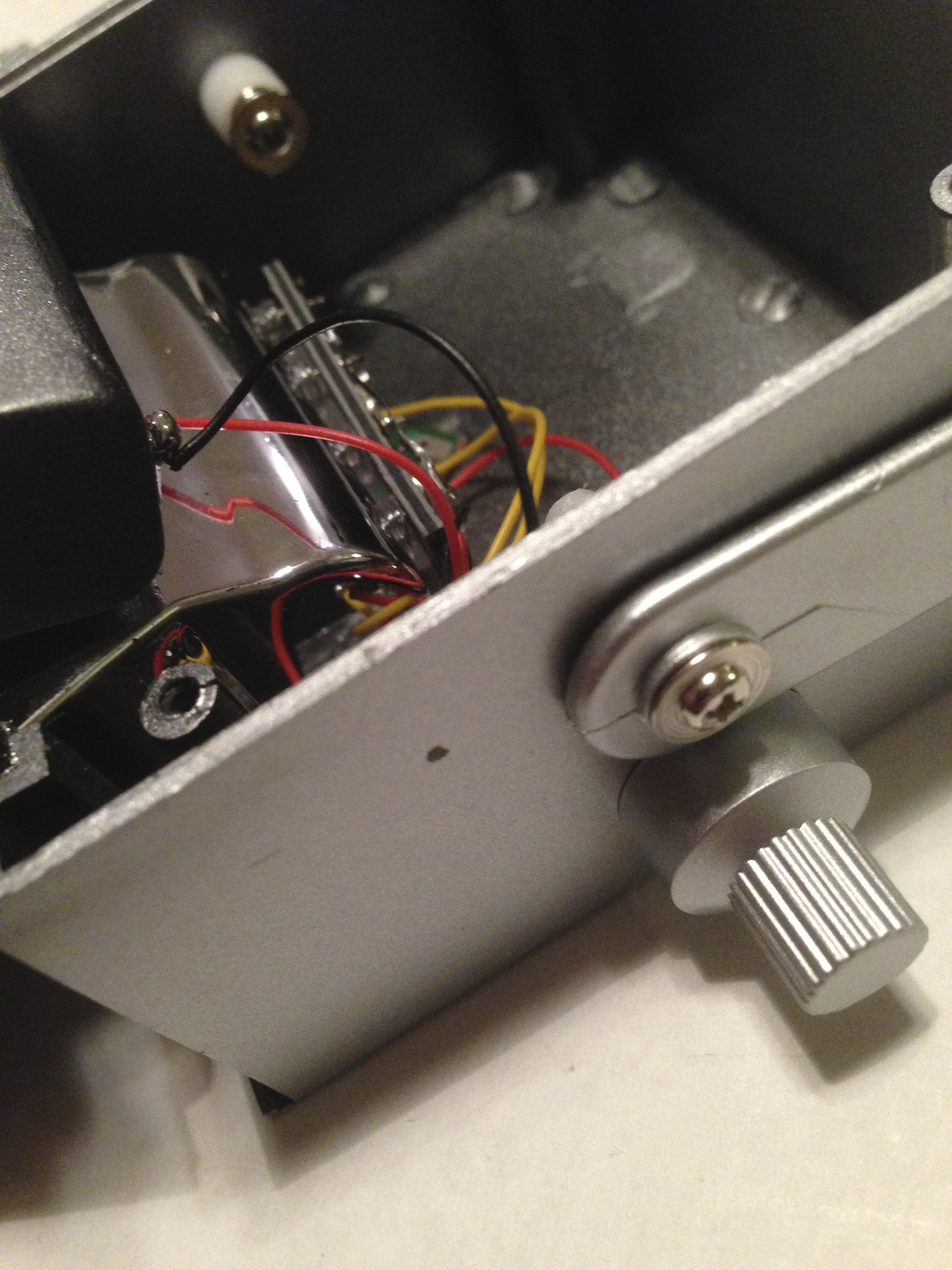 b. Look at the inside of the unit; there is very little open space to work with. In fact, there is just enough space for a small toggle switch and two phono jacks, which is why we are not using 1/4” audio jacks. With the back of the unit facing you the switch will be located to the left, diagonal from the variable speed knob. The phono jacks will be installed in a stack to the right, between the handle screw and the screw post.