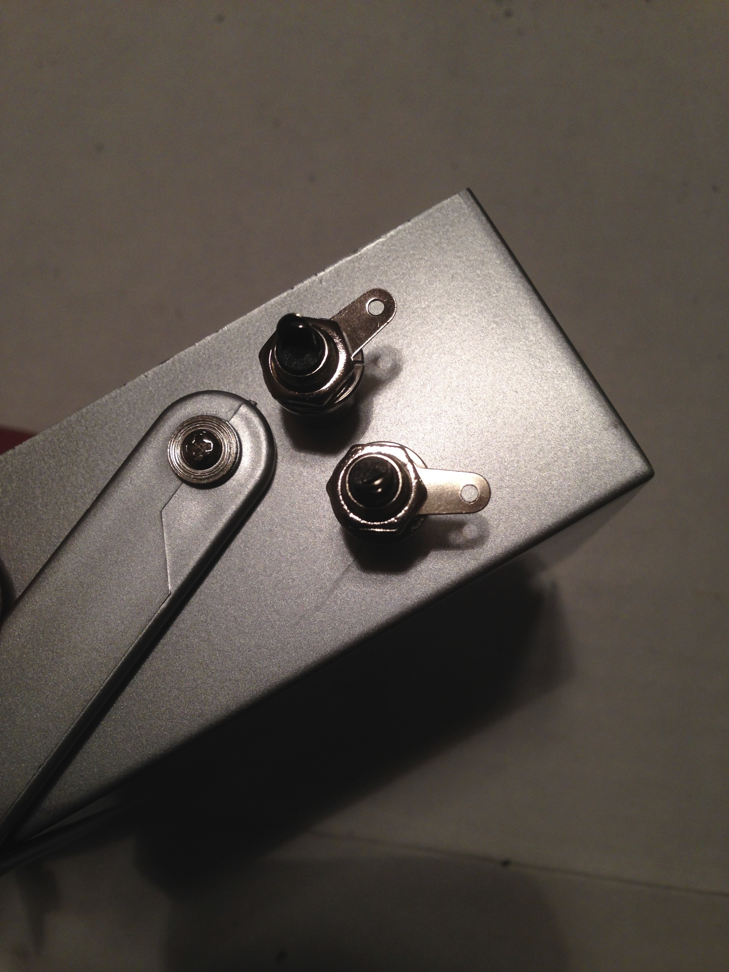 h. Install the two 1/4″ jacks. Unscrew the nut and remove the washer. Install the jack by pushing it through from the inside of the casing; replace the washer and then tighten the nut with pliers. Do the same with the second jack.