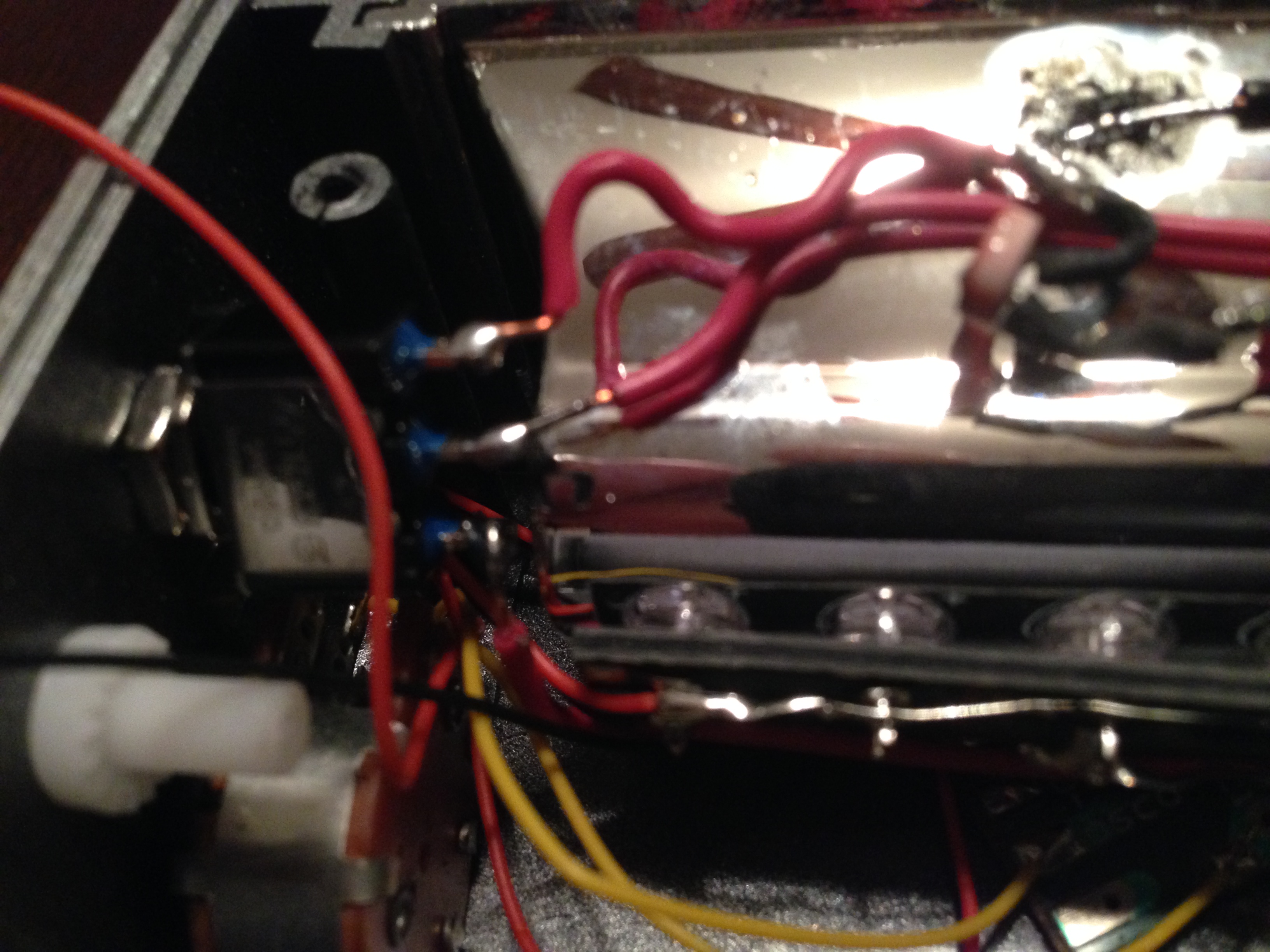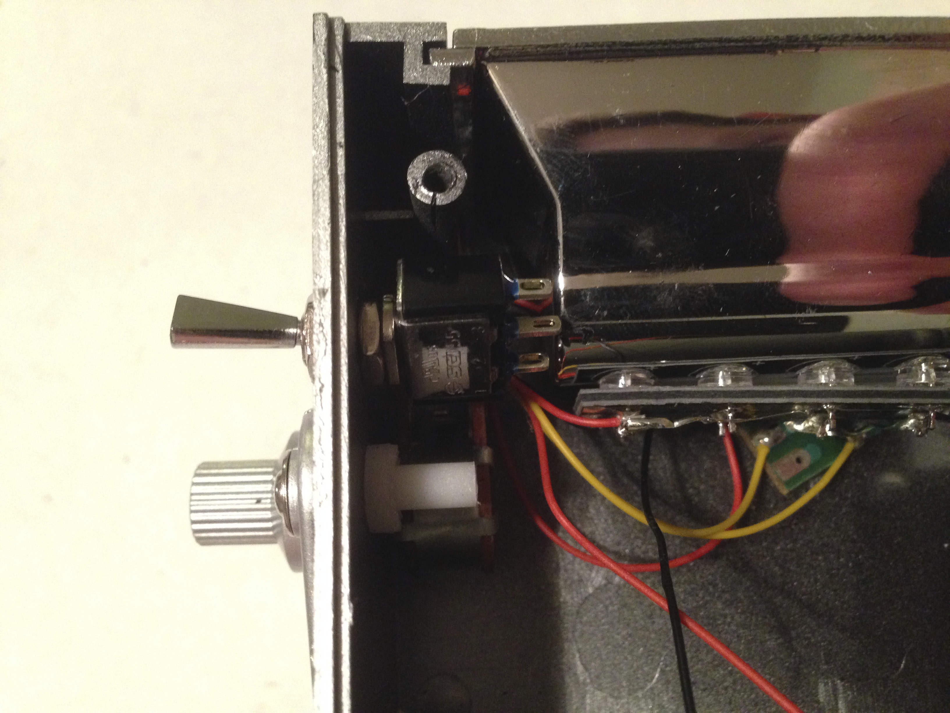 a. Note the distance between the SPDT switch, and the two phono/RCA jacks—cut two red wires.