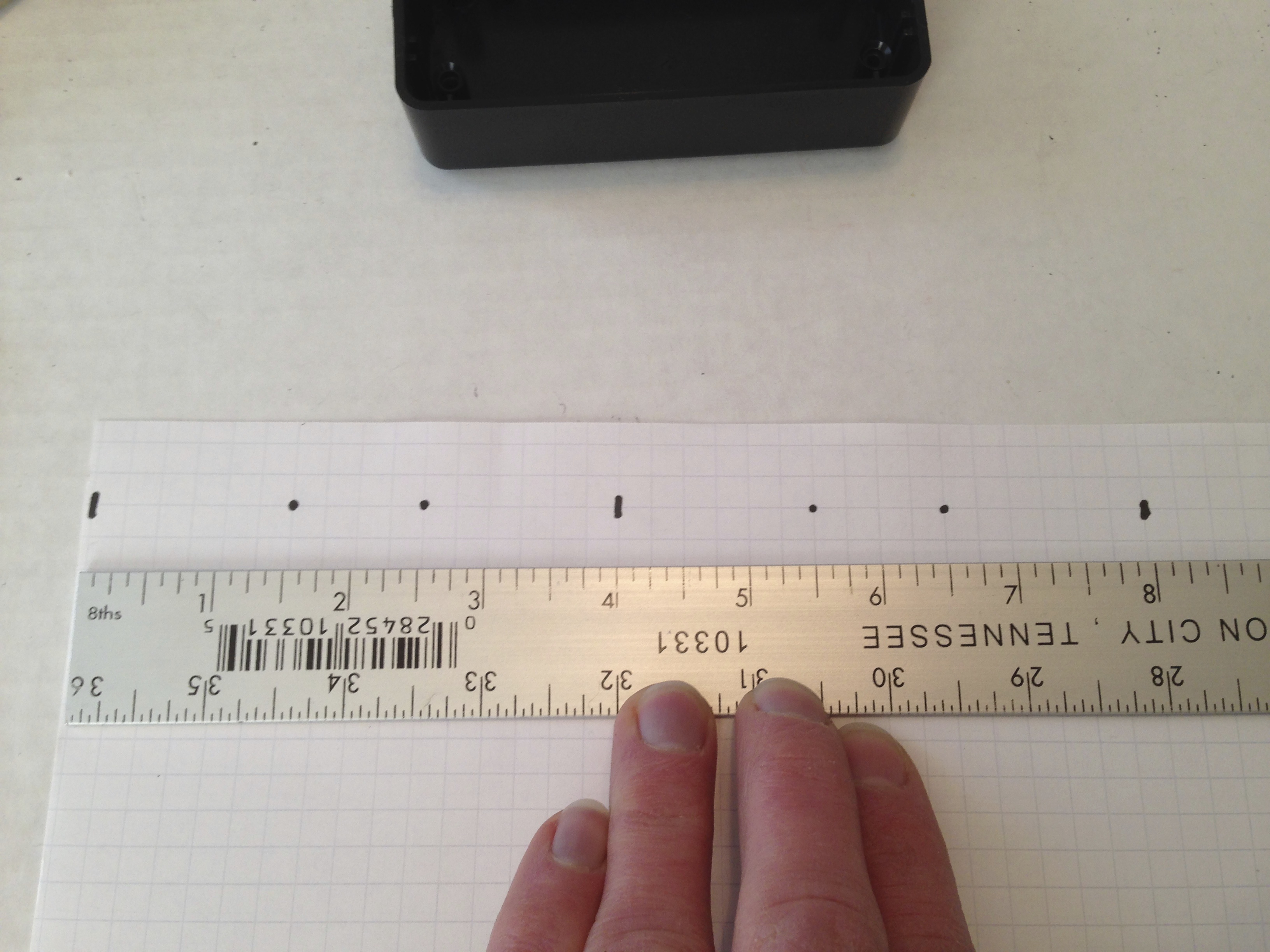 c. On the 1×4 template, starting in the upper-left corner count six squares over to the right and two squares down (1-1/2×1/2) and draw a small dot at the intersection, then in the upper-right corner count six squares over to the left and two squares down (1-1/2×1/2) and draw a small dot at the intersection.