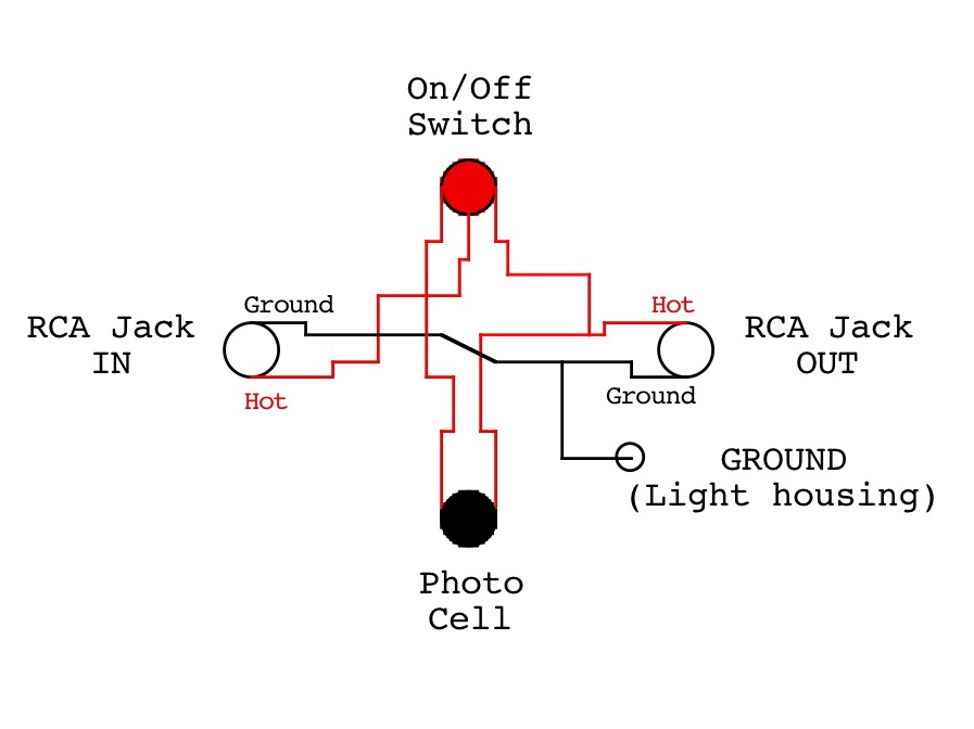 g. Attach one of the red wires bound to the photocell to the upper terminal of the switch and then the other red photocell wire to the center (hot) terminal on the upper phono/RCA jack. Place the photocell and its red wires close to the light housing.